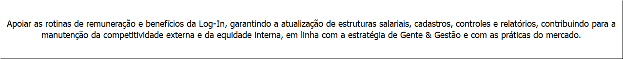 Atuar como referência técnica em Remuneração na Log-In, liderando análises, modelos e projetos de remuneração fixa e variável, suportando decisões estratégicas da Diretoria e de Gente & Gestão. Garantir estruturas salariais competitivas, políticas claras e sustentáveis, equilíbrio interno/externo e aderência a orçamento, contribuindo para atração, retenção e engajamento dos talentos da Companhia, em alinhamento à estratégia do negócio, valores corporativos e Sistema de Gestão Integrada.![]()